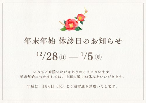 12月28日~1月5日まで年末年始のお休みのため休診させていただきます。